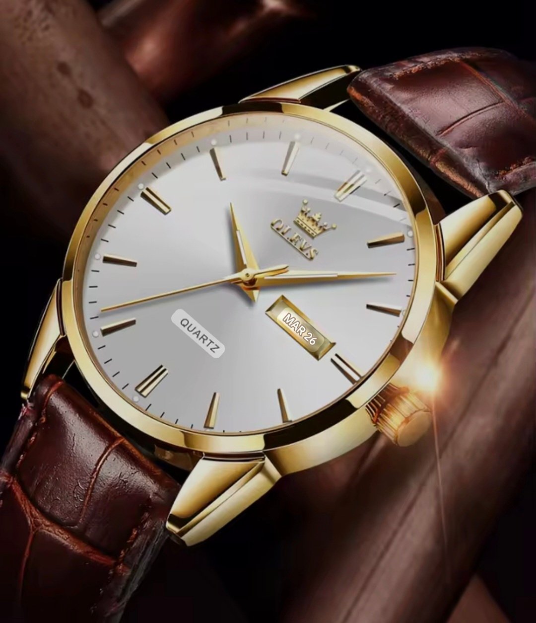 Cette montre OLEVS pour homme incarne une l’élégance ,Son boîtier doré et son cadran blanc épuré d’un bracelet en cuir dotée d’un mouvement quartz fiable et d’un affichage de la date, elle est un bon accessoire pour vos tenue quotidien.