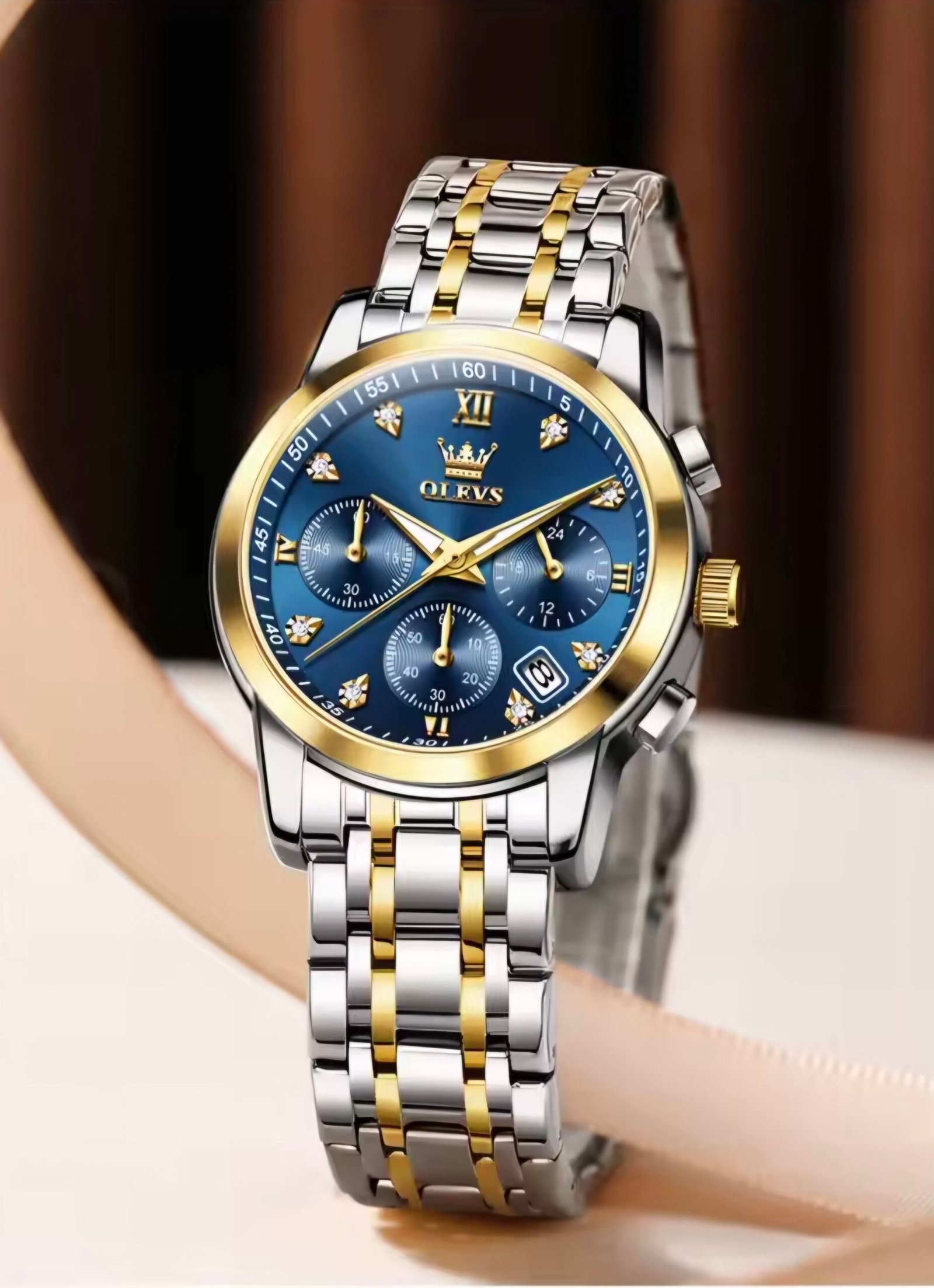 Affirmez votre style avec cette magnifique montre OLEVS de luxe pour femme, un véritable chef-d’œuvre d’horlogerie.  cette montre est l’accessoire  pour  vos tenue . Le bracelet en acier inoxydable arbore une finition bicolore argent et or   offrant un contraste visuel riche. Le cadran d’un bleu profond attire immédiatement le regard. Protégé par un verre minéral trempé résistant aux rayures .